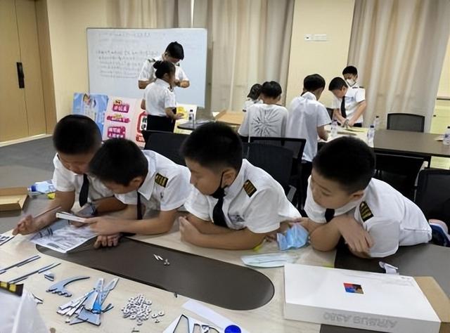 听完机长细致讲解飞机结构后,孩子们一起拼起了木制机模,对飞机有了更直观的认知。在波音-737MAX模拟舱内,资深飞行员及两位空乘老师为孩子们介绍了机内各类设施设备、驾驶舱飞行原理、教学应急救援设备使用、特情防范等,并给小飞行员们举行“授勋仪式”。