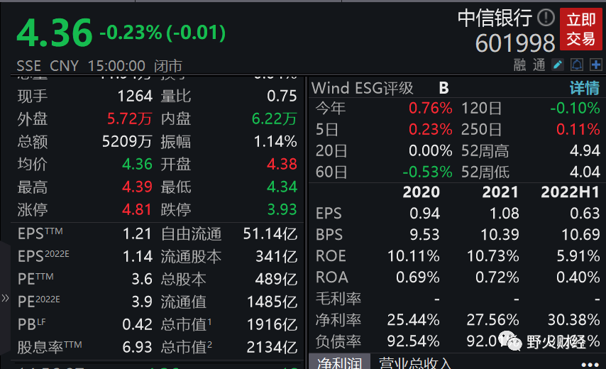 截至8月29日,中信银行市值2163亿元,市盈率(TTM)为3.7倍,市净率0.41倍,股息率达到6.83%。
