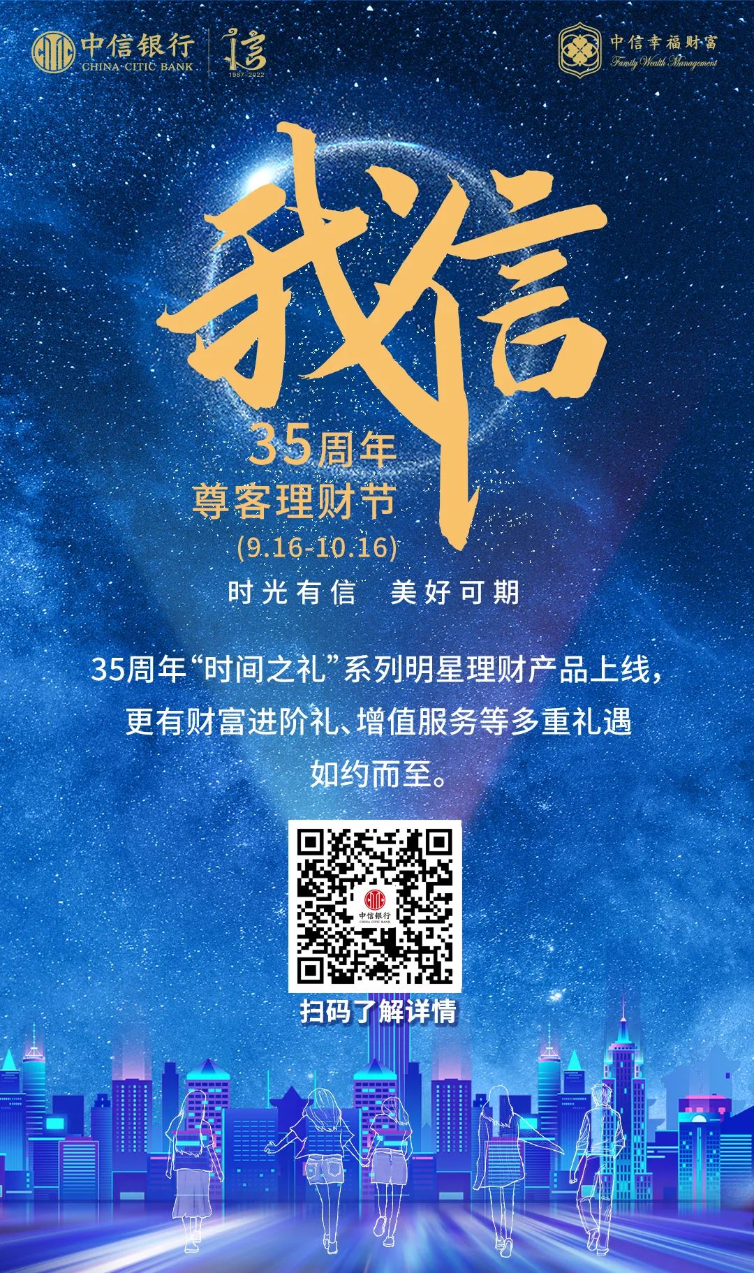 2022年9月16日-10月16日期间,以35周年品牌焕新为契机,中信银行推出了“我信”35周年尊客理财节,借势中信银行品牌升级和全渠道触客能力,结合目前市场情况,为客户推出品类多样的理财产品配置,全面满足各类客群的金融需求,助力客户实现财富保值和增值。