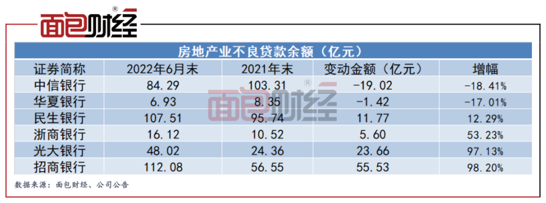 数据显示,截至2022年6月末,共有6家股份行公布房地产业不良贷款余额。其中,中信银行的房地产业不良贷款余额为84.29亿元,较上年末下降19.02亿元,降幅为18.41%,降幅最大。