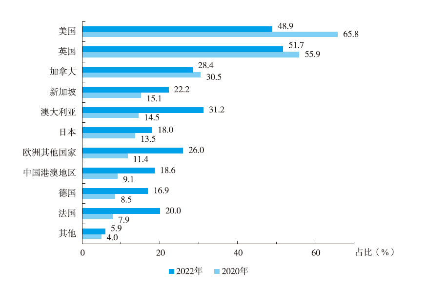 2022年的调研数据显示,在意向留学生群体计划的留学国家或地区中,英国位居榜首(51.7%),其次是美国(48.9%)。