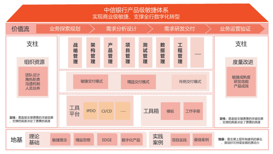 5.产品级敏捷实践。经过1年多的深入实践,中信银行进一步完善了产品级敏捷体系框架(如图2所示),取得了行之有效的业技目标对齐方法及价值评估机制,并在信托管、财富基金、汽车金融和银法通等产品线开展试点,涉及新产品建设、现有产品迭代升级、线下转线上和快速创新复制等各类业务形态,业务成效显著。