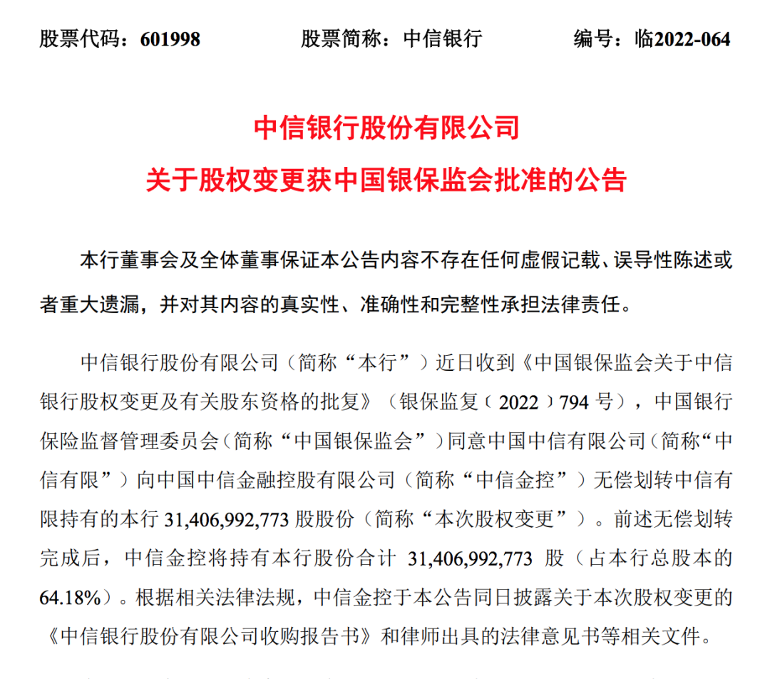 11月7日,中信银行发布公告称,近日该行收到《中国银保监会关于中信银行股权变更及有关股东资格的批复》,银保监会同意中国中信有限公司(简称“中信有限”)向中国中信金融控股有限公司(简称“中信金控”)无偿划转中信有限持有的该行约314.07亿股股份,无偿划转完成后,中信金控将持有该行股份合计约314.07亿股,占该行总股本的64.18%。