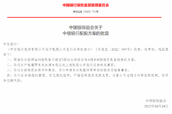 11月8日消息,银保监会官网发布关于中信银行配股方案的批复。银保监会同意该行按照每10股配售不超过3股的比例向全体A股和H股股东配售股份的方案。