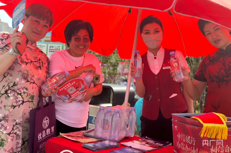 中信银行哈尔滨分行自贸区支行工作人员在哈尔滨市第九十五中学考点为家长送清凉(央广网记者庞淼摄)