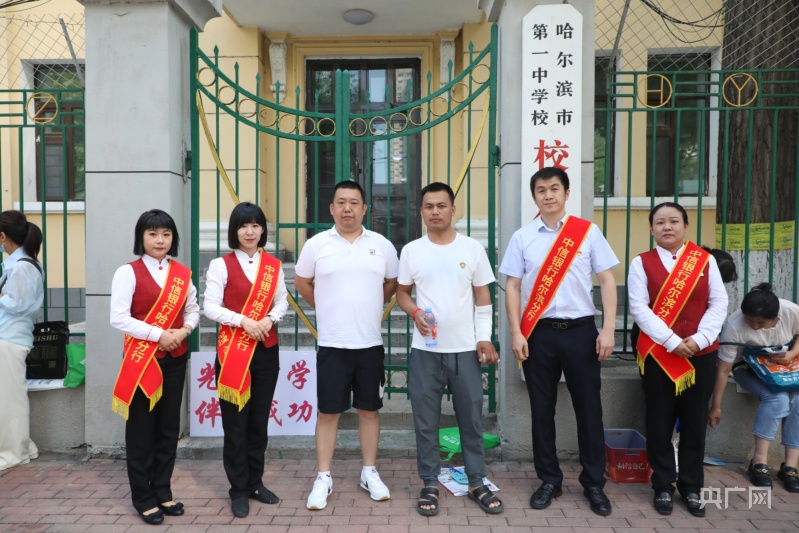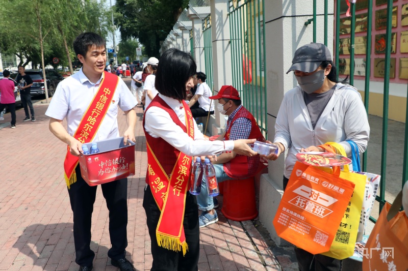 中信银行哈尔滨分行道里支行工作人员在哈尔滨市第一中学校考点为考生加油助力(央广网发徐旭摄)