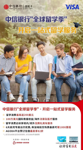 今年,随着留学相关考试的恢复、各大院校恢复线下课堂,出入境政策放开,中国留学市场回暖。对此,中信银行于今年3月针对留学家庭的金融服务需求,全新升级中信银行Visa逍遥白金卡,依托出国金融业务优势,打造覆盖留学上从出国到归国全旅程一站式金融服务,陪伴广大学子获享有温度的留学生活。与此同时,首次发行“少年行”主题信用卡,面向私人银行和潜在私人银行客户子女推出,主打海外法律、海外医疗咨询服务,百万美金国际救援,留学缴费、留学生活消费返现,全球全币种免货币转换费等多种权益加持,涵盖留学准备、行前准备、留学生活各阶段需求,可作为多类主卡的附属卡,一拍即付,更方便、更快捷、更安全。