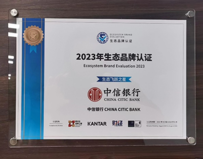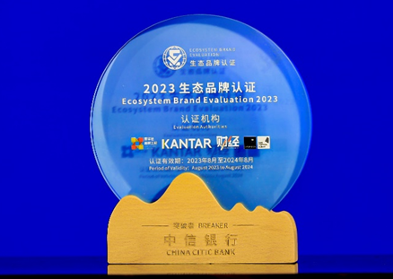 2023年8月29日,“2023(第二届)生态品牌大会”在北京举行,会上正式发布“2023年生态品牌势能图”,揭晓第二批成功获得生态品牌认证的品牌,推出《生态品牌发展报告(2023)》。中信银行从参评的百余个品牌中脱颖而出,在榜单中处于“突破者”位置,第二次获得生态品牌认证,并被评为“生态飞跃之星”。