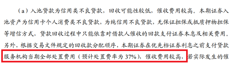在发行说明书中,中信银行特地提到本次入池贷款为信用类不良贷款,回收可能性较低,催收费用较高。本期证券入池资产为信用卡个人消费类不良贷款,为纯信用不良贷款,无保证担保或抵质押物担保等增信方式,贷款服务机构当期全部处置费用高达37%。
