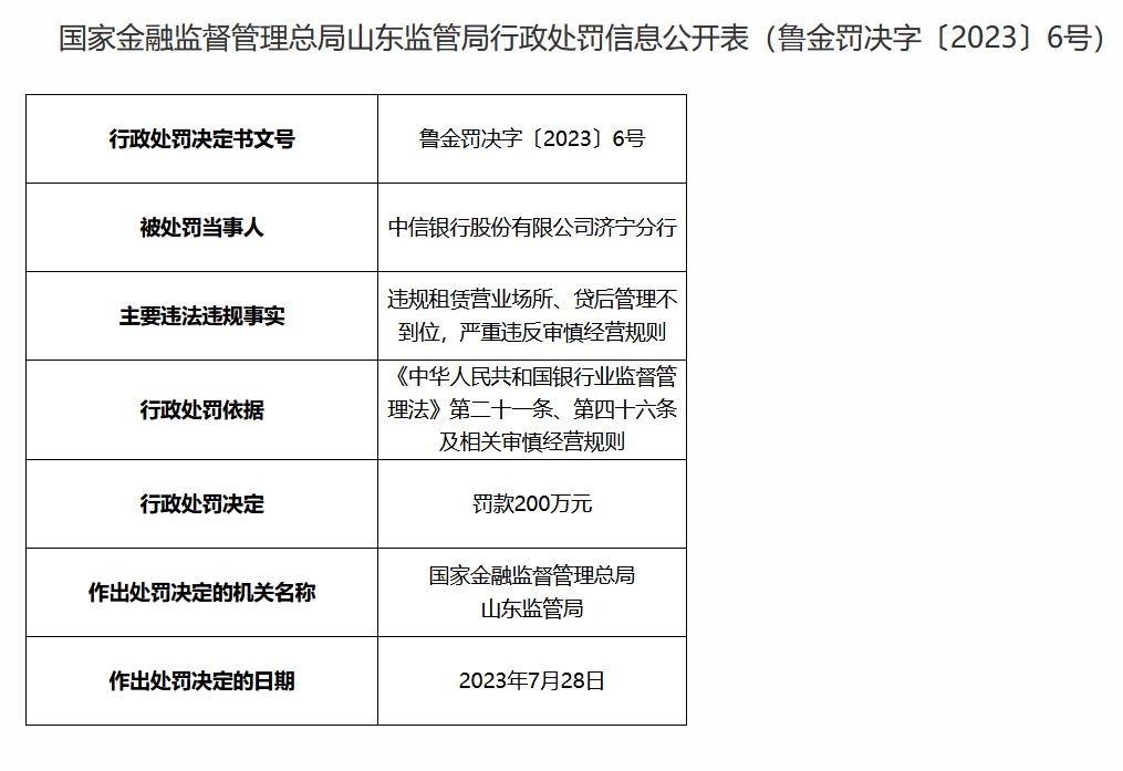 8月4日,国家金融监督管理总局山东监管局(下文简称“山东监管局”)发布鲁金罚决字〔2023〕6号,中信银行济宁分行因违规租赁营业场所、贷后管理不到位,严重违反审慎经营规则等主要违法违规事实,依据《中华人民共和国银行业监督管理法》第二十一条、第四十六条及相关审慎经营规则被罚款200万元。在鲁金罚决字〔2023〕12号中,时任中信银行股份有限公司济宁分行行长的王中兴因对中信银行股份有限公司济宁分行违规租赁营业场所、贷后管理不到位,严重违反审慎经营规则负有责任,被取消终身高级管理人员任职资格,禁止终身从事银行业工作。