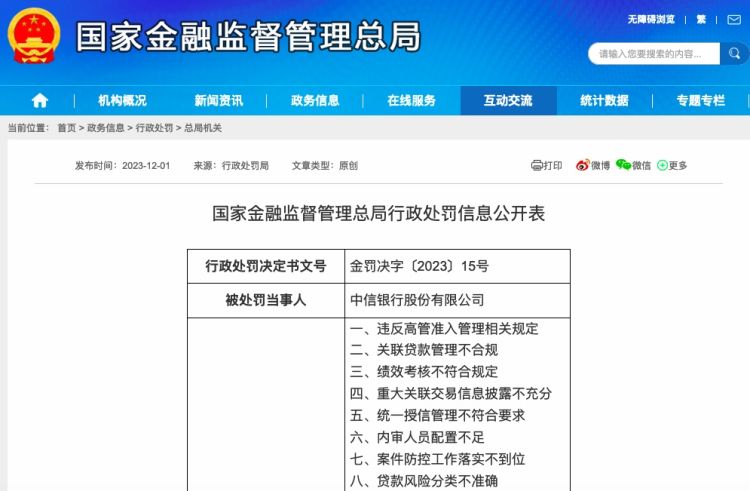 12月1日,国家金融监督管理总局行政处罚信息公开表显示,中信银行股份有限公司涉关联贷款管理不合规、重大关联交易信息披露不充分、理财产品承接违约资产、并购贷款“三查”失职等56项违法违规行为,被国家金融监督管理总局罚款15242.59万元、没收违法所得462.59万元,分支机构被罚款6770万元;罚没合计22475.18万元。