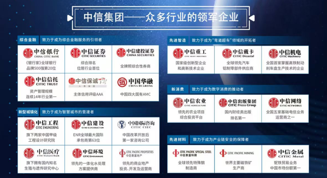 “中信”这两个字的分量不用多说。作为金融与实业并举的大型综合性企业集团,中信在综合金融服务、先进智造、新材料、新消费、新型城镇化五大板块形成了独特竞争力和品牌影响力。旗下中信银行、中信证券、中信建投证券、中信信托、中信保诚人寿、华夏基金、中信期货等集团子公司,都是各自领域行业内的头部机构。