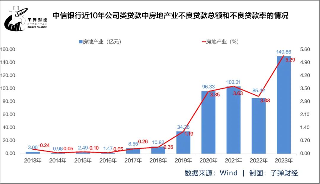 然而,好景不长。中信银行2023年半年报显示,该行公司类贷款不良率中房地产业不良贷款率为5.29%,较上年末上升2.21%,在各行业中居首且升幅最高。房地产不良贷款总额飙升至149.86亿元,较上年末85.42亿元增64.44亿元。
