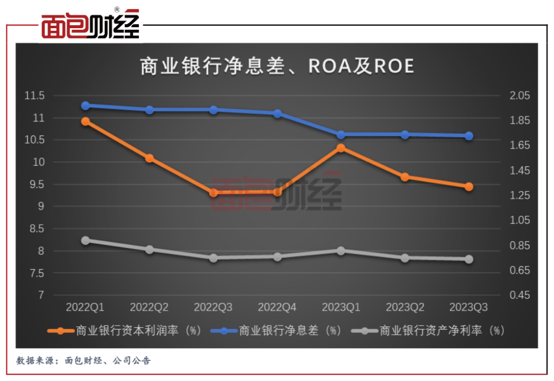 国家金融监督管理总局披露的数据显示,2022年一季度以来,商业银行的净息差整体呈下降趋势,由1.97%降至2023年三季末的1.73%。2023年三季度,商业银行资本利润率及资产净利率分别为9.45%及0.74%,较2022年一季度分别下降1.47及0.15个百分点。