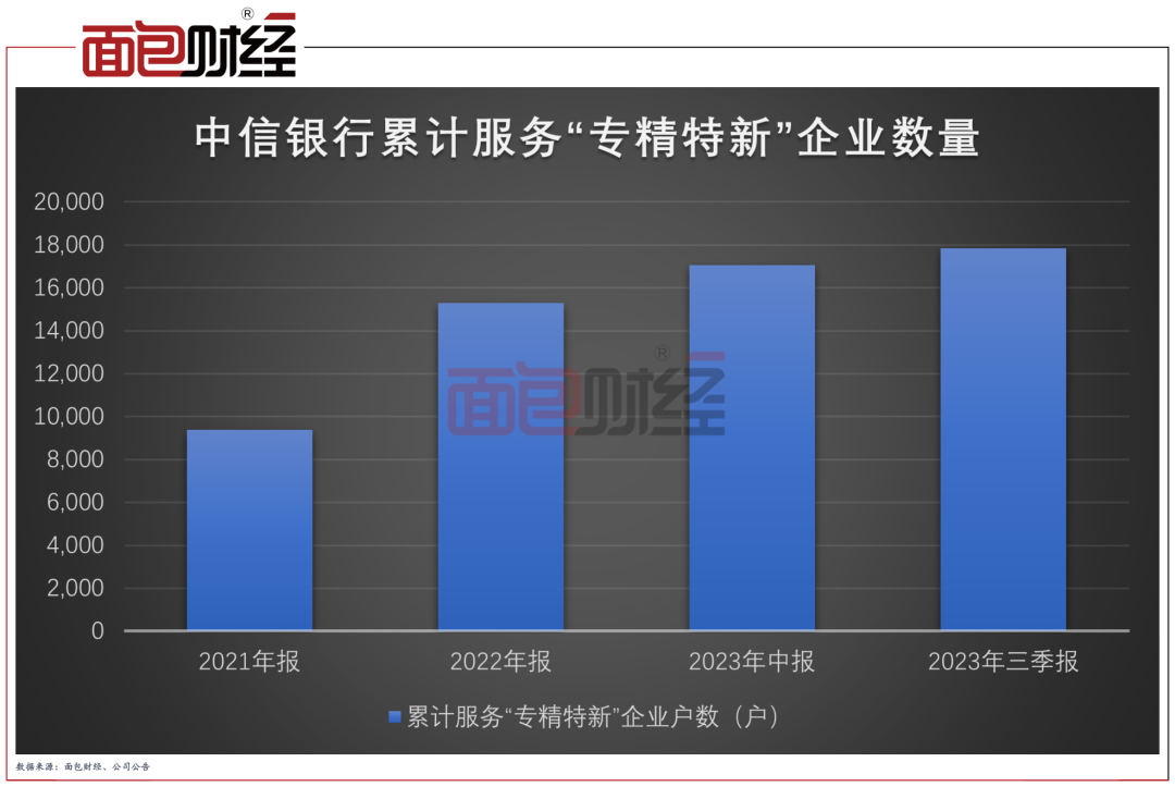 以专精特新企业为例,财报数据显示:截至2023年9月末,该行累计服务“专精特新”企业17853户,较上年末增加2831户。