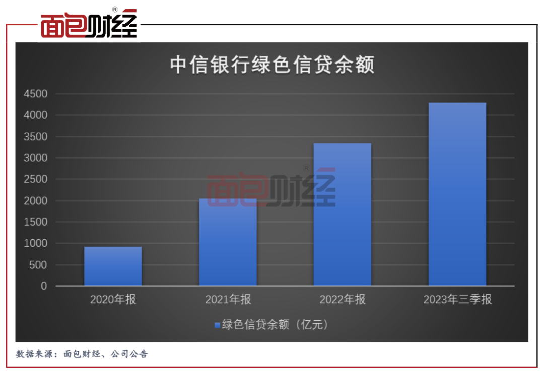 财报显示,截至2023年9月末,中信银行绿色信贷余额突破4000亿元大关,达到4282.92亿元,较上年末增长28.20%,绿色贷款增速大幅超过全行贷款增速。较2020年末的922.01亿元增长364.52%。这意味着在不到三年的时间内,中信银行的绿色信贷余额实现了超过3倍的增长,已经成为该行增长最快的领域之一,同期增速位居同类银行前列。