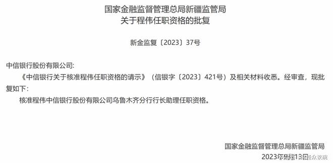 2023年9月13日,国家金融监督管理总局新疆监管局作出《国家金融监督管理总局新疆监管局关于程伟任职资格的批复》(新金监复〔2023〕37号),对中信银行程伟拟任乌鲁木齐分行行长助理的申请事项予以核准。