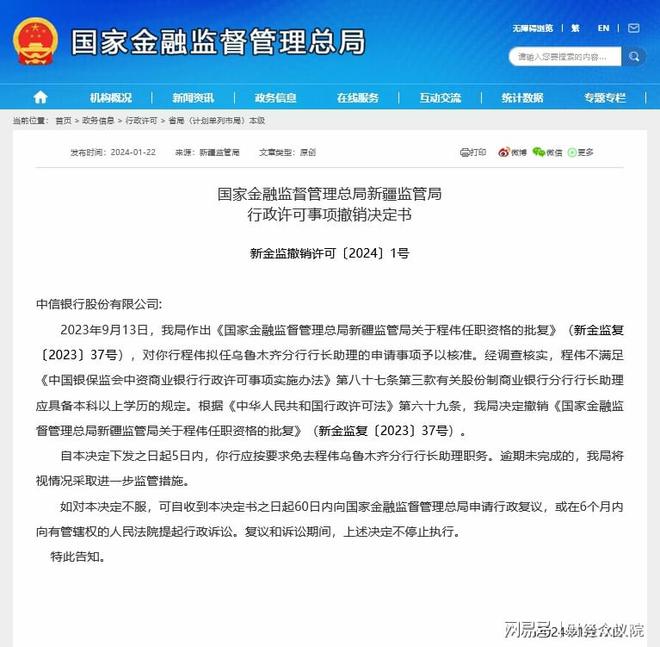 1月22日下午,国家金融监督管理总局官网披露,中信银行乌鲁木齐分行行长助理程伟被撤销任职资格,监管责令该行尽快免职。