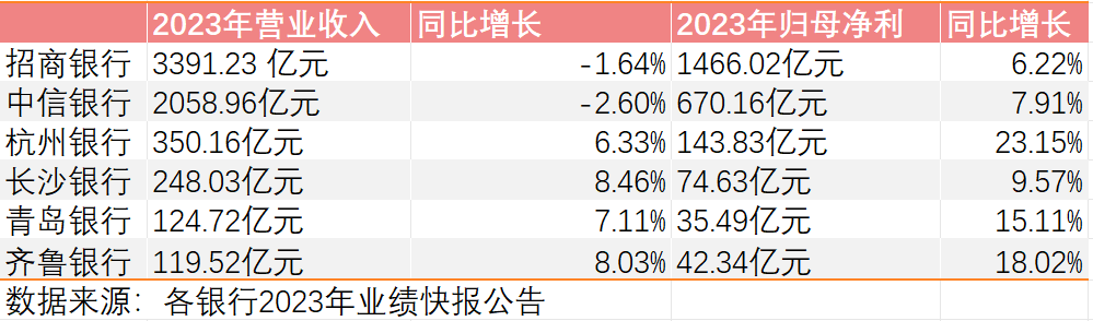 数据显示,营业收入方面,上述6家银行中,杭州银行、长沙银行、青岛银行、齐鲁银行4家银行2023年营业收入实现同比增长,招商银行、中信银行营业收入同比下降。