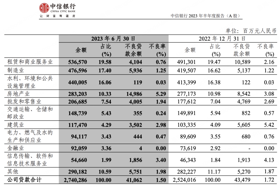 即便如此,中信银行的房地产业务贷款余额截至去年上半年仍高达2832.03 亿元,占公司贷款总额的10.33%,同时也是公司不良率最高的行业,为5.29%。