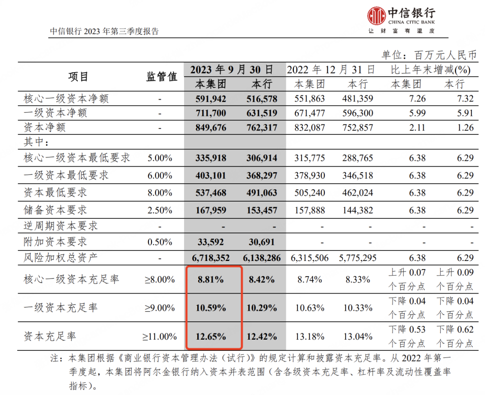 此外,截至2023年三季度,中信银行核心一级资本充足率为8.81%;一级资本充足率为10.59%;资本充足率为12.65%。