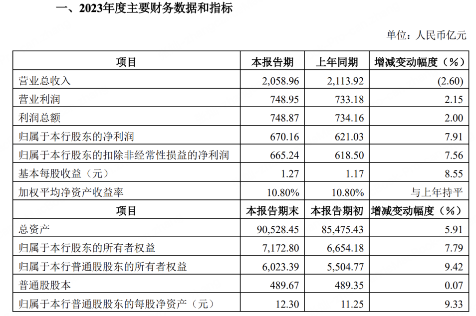 数据显示,2023年该行实现营收2058.96亿元,较上年同期下降2.6%;