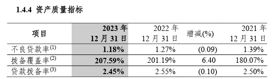 资产质量方面,2023年末,该行不良贷款余额648亿元,比上年末减少4.13亿元,下降0.63%;不良贷款率1.18%,比上年末下降0.09个百分点;拨备覆盖率207.59%,比上年末上升6.4个百分点。