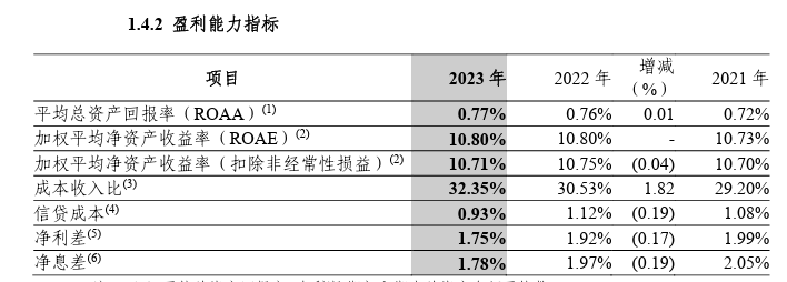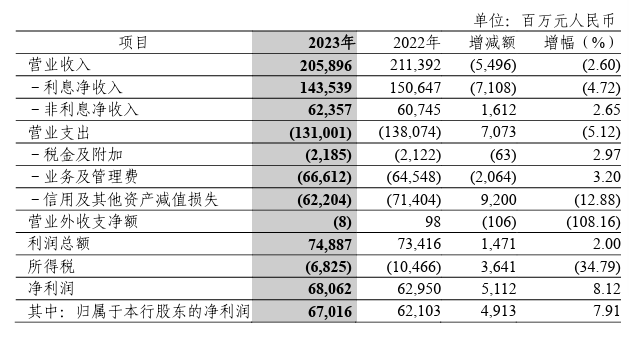 报告期内,中信银行实现营业收入2058.96亿元,比上年下降2.60%;实现归属于本行股东的净利润670.16亿元,比上年增长7.91%;平均总资产回报率(ROAA)为0.77%,比上年上升0.01个百分点,加权平均净资产收益率(ROAE)为10.80%,与上年持平。