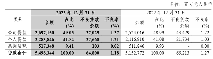 具体来看,公司不良贷款(不含票据贴现)余额较上年末减少64.50亿元,不良率较上年末下降0.35个百分点;个人不良贷款余额较上年末增加59.34亿元,不良率较上年末上升0.18个百分点。