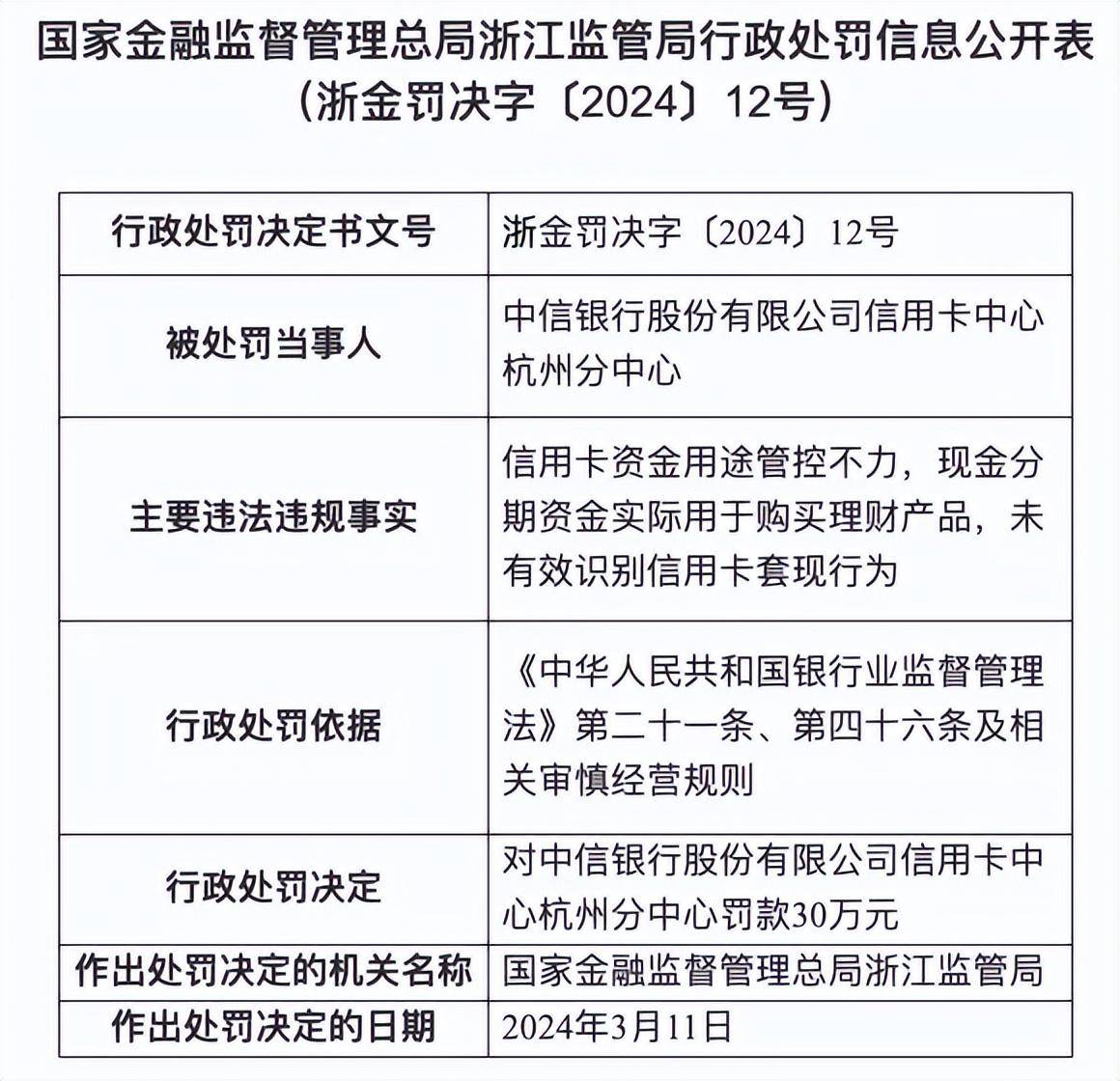 就在今年的3月11日,国家金融监督管理总局浙江监管局公布了一张罚单,指出中信银行信用卡中心杭州分中心存在信用卡资金用途管控不力、现金分期资金实际用于购买理财产品以及未有效识别信用卡套现行为等问题,并对其处以30万元的罚款。