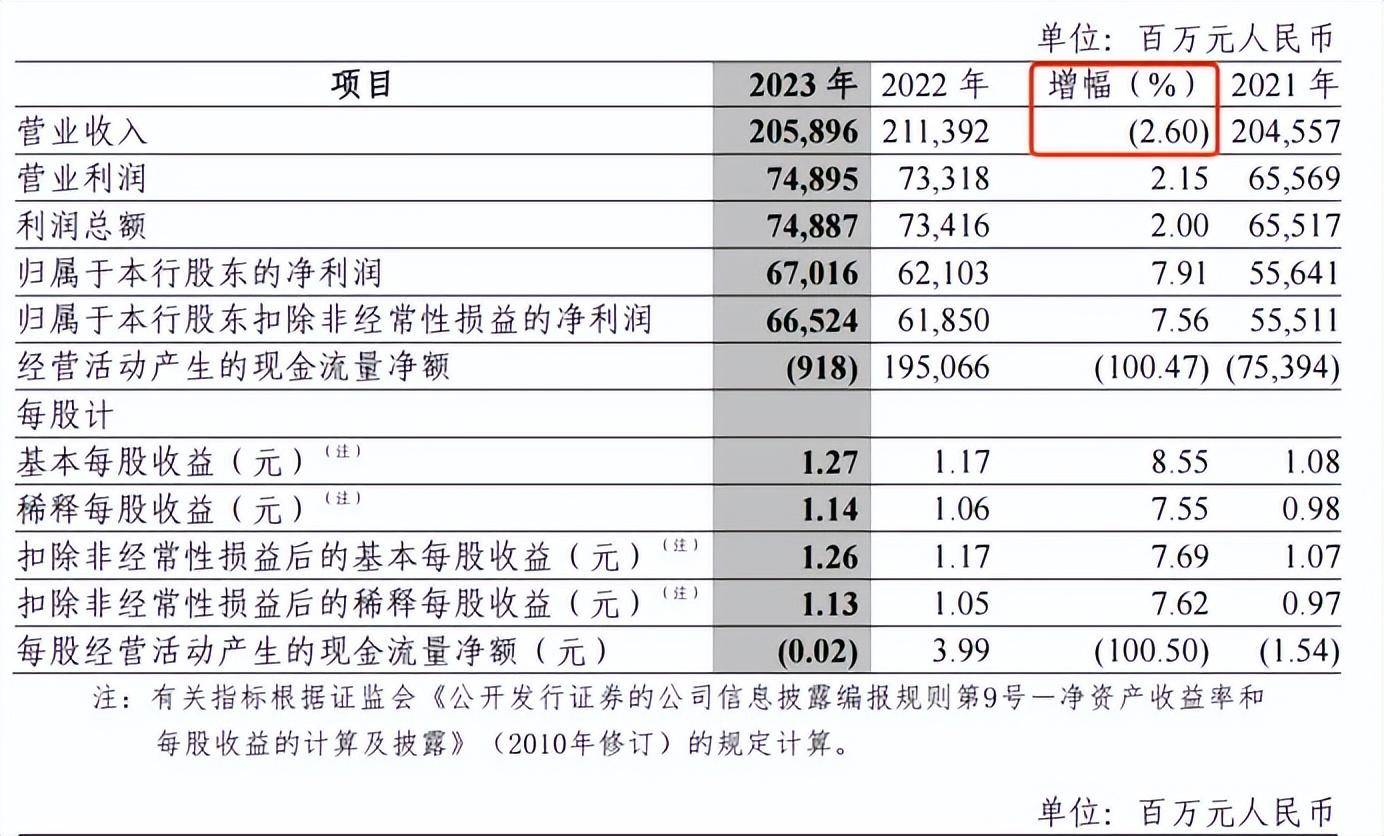 营收下滑:中信银行2023年的总营收为2059亿人民币,同比下降2.60%。