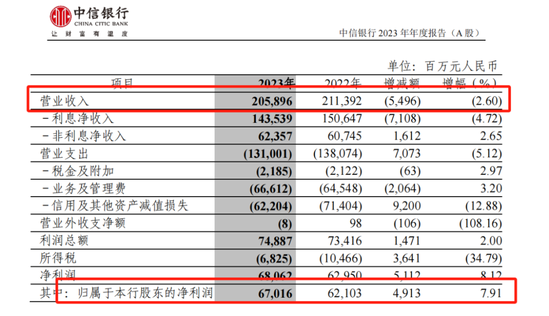 2023年,中信银行营业收入2058.96亿元,比上年下降2.60%;实现归属于本行股东的净利润670.16亿元,比上年增长7.91%。