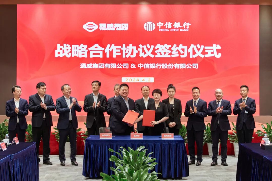 4月2日,通威与中信银行在通威国际中心共同签署了战略合作协议。全国人大代表、全国工商联副主席、通威集团董事局刘汉元主席,中信银行党委副书记、行长刘成出席并见证签约。中信银行大客户部负责人殷亮、通威集团总裁禚玉娇代表双方签约。