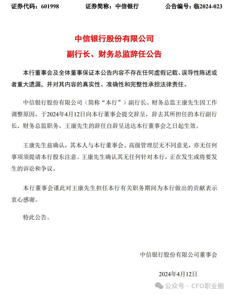 2024年4月12日,中信银行发布副行长、财务总监辞任公告。
