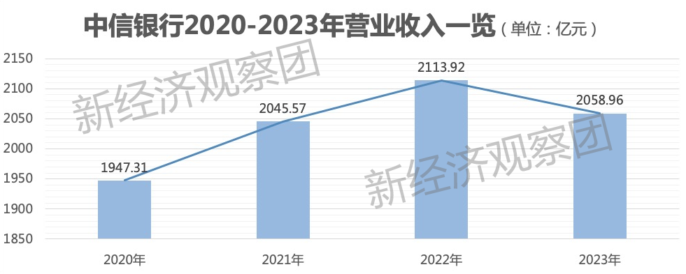 由于银行业净息差整体承压,中信银行的2023年过得并不舒畅。2023年,中信银行实现营业收入2058.96亿元,相比2022年下降2.6%。而这也是自2010年以来,中信银行营收水平的首次下滑。