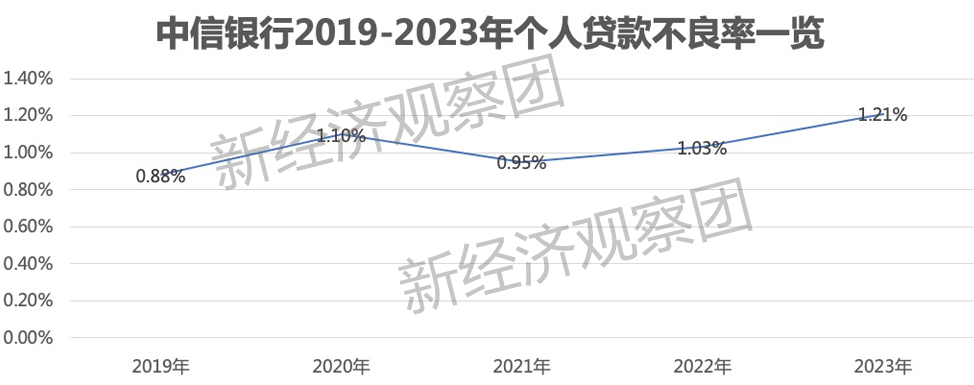放长时间区间,会发现这已经是中信银行个人贷款不良率连续两年向上增长。2020年,中信银行的个人贷款不良率从上年的0.88%上升至1.1%,2021年下滑至0.95%,2022年又再度抬升至1.03%,到2023年,该行个人贷款不良率再度攀升至1.21%。