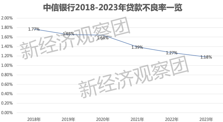 不仅如此,这还是中信银行不良贷款率连续五年呈现下滑态势。新经济观察团就统计发现,2018年,中信银行不良贷款率曾达到1.77%,此后连续五年下滑,2019-2022年,该行不良贷款率分别为1.65%、1.64%、1.39%以及1.27%,直到2023年的1.18%。