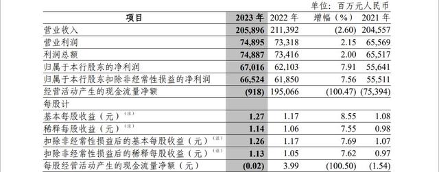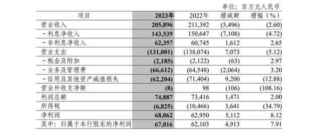 中信银行在2023年的营业收入2058.96亿元,比上年下降2.60%;实现归属于本行股东的净利润670.16亿元,比上年增长7.91%。