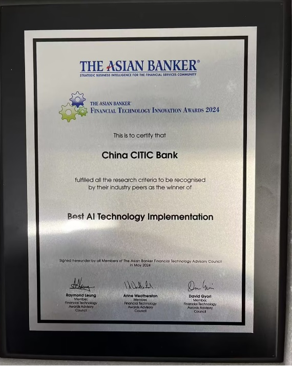我行仓颉大模型平台凭借前瞻创新能力和技术优势荣获国际奖项最佳人工智能技术实施类项目(Best AI Technology Implementation),国内仅我行与工行2家银行获得国际奖项殊荣。