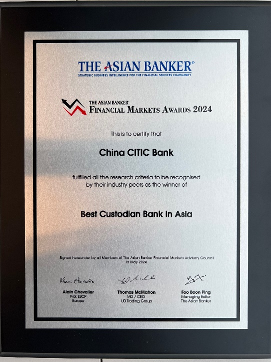 中信银行凭借在资产托管业务领域的出色表现,在众多银行中脱颖而出,继2023年获“中国年度股份制托管银行”后再获国际奖项“亚洲最佳托管银行”,体现了业界对中信托管的高度认可。