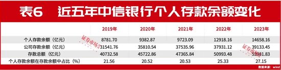 本刊统计了中信银行近年来部分零售业务的数据。从数据可以看出,在截至2023年的过去五年,中信银行的个人存款余额增长了近70%。