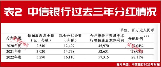 与此同时,中信银行也在加大对股东的回报。过去三年,中信银行持续增加对于股东的分红。7月10日中信银行对A股普通股东派发2023年股息,每10股派发现金红利3.261元,分红率28.11%。受此消息影响,当天中信银行上涨了1.095%。