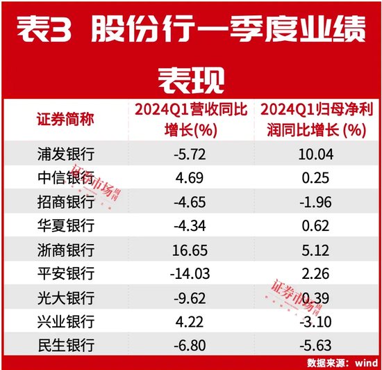 从表3可以看出,一季度实现营收和归母净利润实现双涨的上市股份行仅有2家,一家是中信银行,另一家是浙商银行。