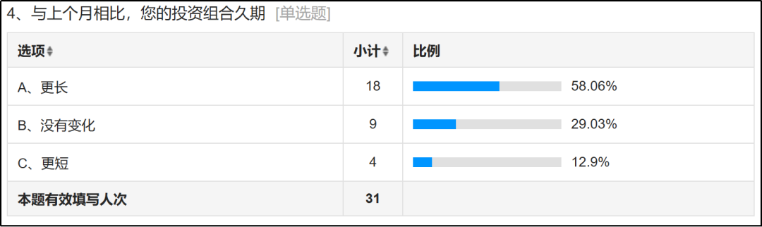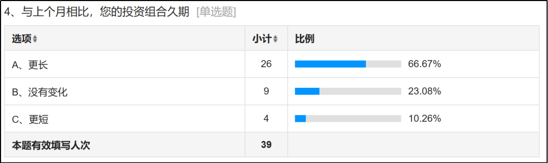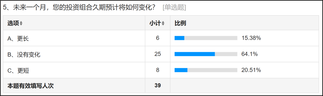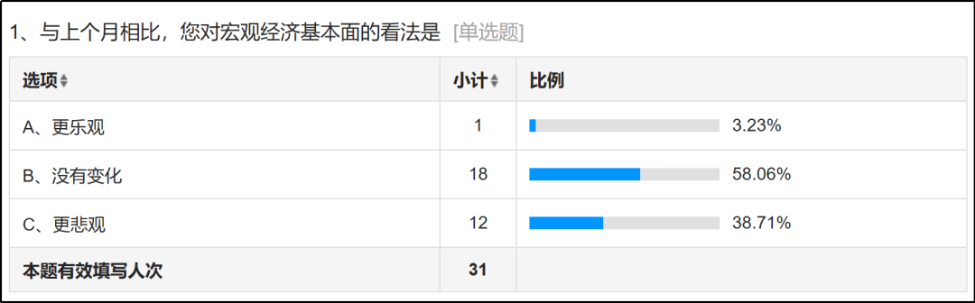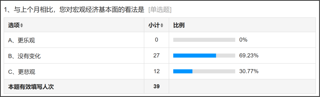 69%的基金经理表示经济与上月相比没有明显变化。31%的基金经理表示对经济更加悲观了,这个数值较上月有所降低。总体来看,受访者对宏观经济持有中性偏悲观的立场。