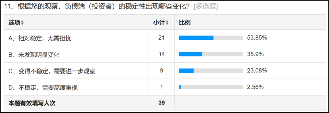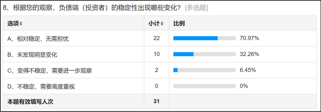 25%的基金经理表示负债端变得不稳定且需要进一步观察或者高度重视,比上个月大幅增加了19个百分点。