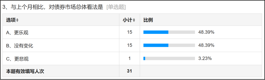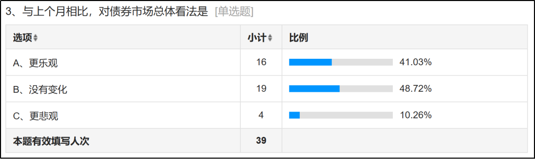 49%的基金经理没有改变对债市的看法,占比与上月持平;41%的基金经理表示更乐观了,占比较上月有所下降;10%的基金经理表示更悲观了,占比有所上升。总体来看,基金经理们对债市中性偏乐观。