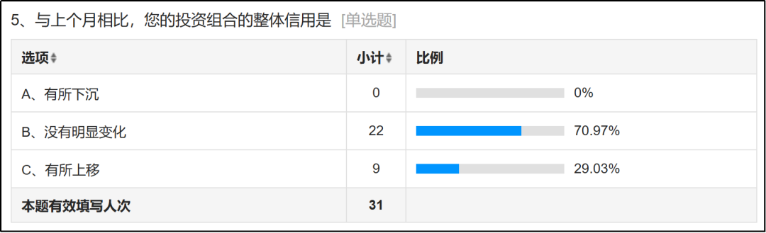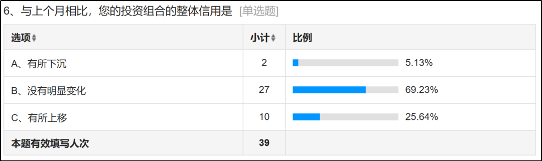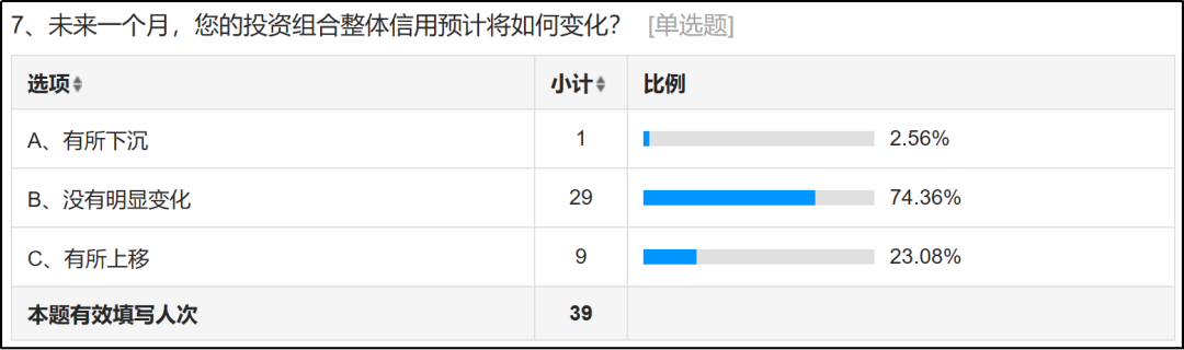 69%的基金经理表示他们组合的信用等级没有变化,数值与6月没有明显变化。25%的基金经理上移了信用等级。