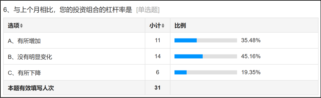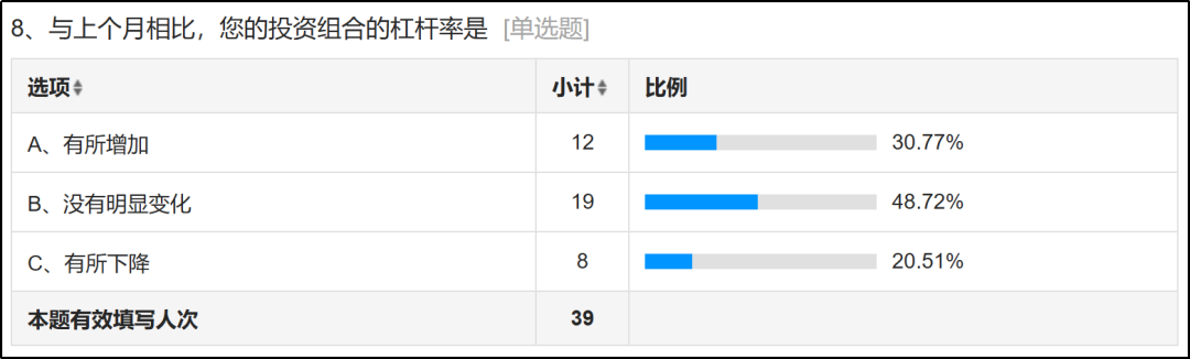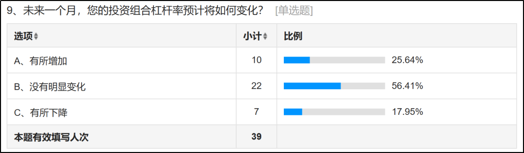 49%的基金经理表示七月份组合杠杆率没有变化,31%的基金经理增加了自己组合的杠杆率,其余20%的基金经理表示降低了组合杠杆率。
