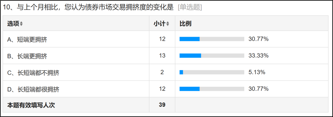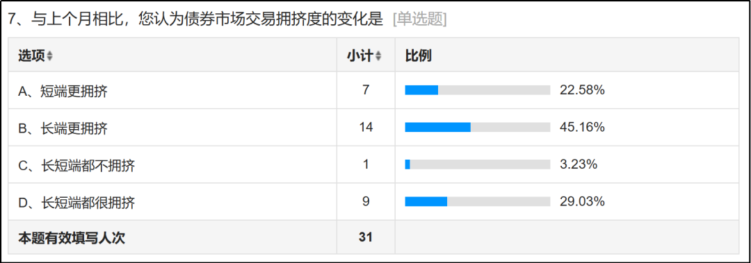 本月31%基金经理认为短端拥挤度较高,比上个月增加了8个百分点;33%的基金经理则认为长端更拥挤,比上月减少了12个百分点;31%的基金经理认为短端和长端都很拥挤,比上个月增加了2个百分点。