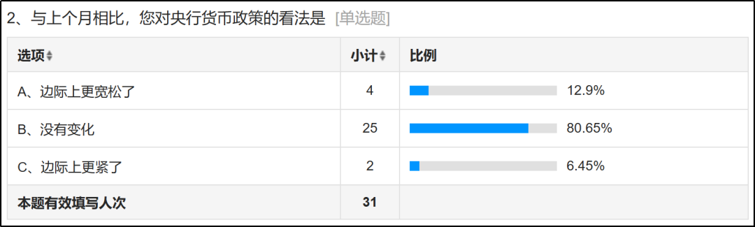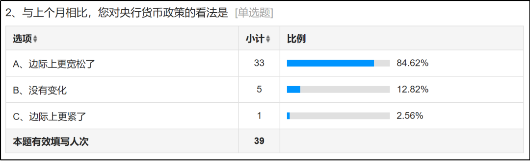 84%的基金经理认为7月份货币政策较上月更加宽松了,本月央行降息落地。近13%的基金经理表示没有货币政策宽松度其实没有明显变化。